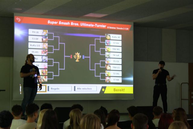 Bereits in den Vorrunden zeichneten sich spannende Kämpfe ab – sei es durch Gerold Wolf, der mit Bowser die Stages aufräumte, oder durch Herrn Nell, der sich mit Pikachu blitzschnell auf seine Gegner stürzte (und anschließend von der Plattform ;-). Auch Kerim Tütüncü konnte mit Melinda ordentlich Druck aufbauen und seine Gegner an den Rand des Wahnsinns treiben. Nicht zuletzt wurden auch die Hände aller Zuschauerinnen und Zuschauer schwitzig, als Felix Koch und Fabian Böckling in einem 1vs1 der Meisterklasse aufeinandertrafen und die Mensa zum Kochen brachten!