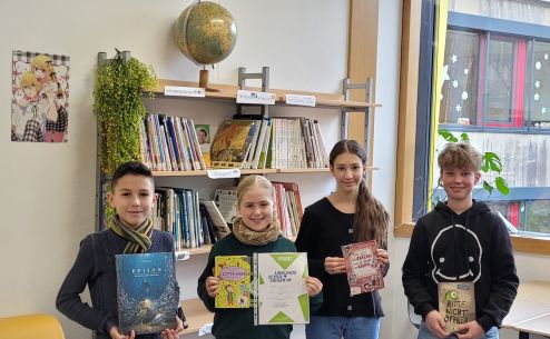 In der Endrunde um den Schulsieg konnte sich dann mit einer beeindruckenden Leseleistung Amelie Wege (6d) gegen Lennard Hilse (6a), James Bauer (6b) und Emine Akman (6c) durchsetzen. Sie las nicht nur ihren geübten Wahltext hervorragend, sondern konnte auch den unbekannten Text ohne Probleme flüssig lesen und dabei fesselnd interpretieren. Wir sind stolz auf dich, Amelie, aber auch auf alle anderen Teilnehmerinnen und Teilnehmer. Es ist toll zu sehen, dass das Lesen wieder beliebter wird und die Kinder mit Freude in ihre Fantasiewelten abtauchen.